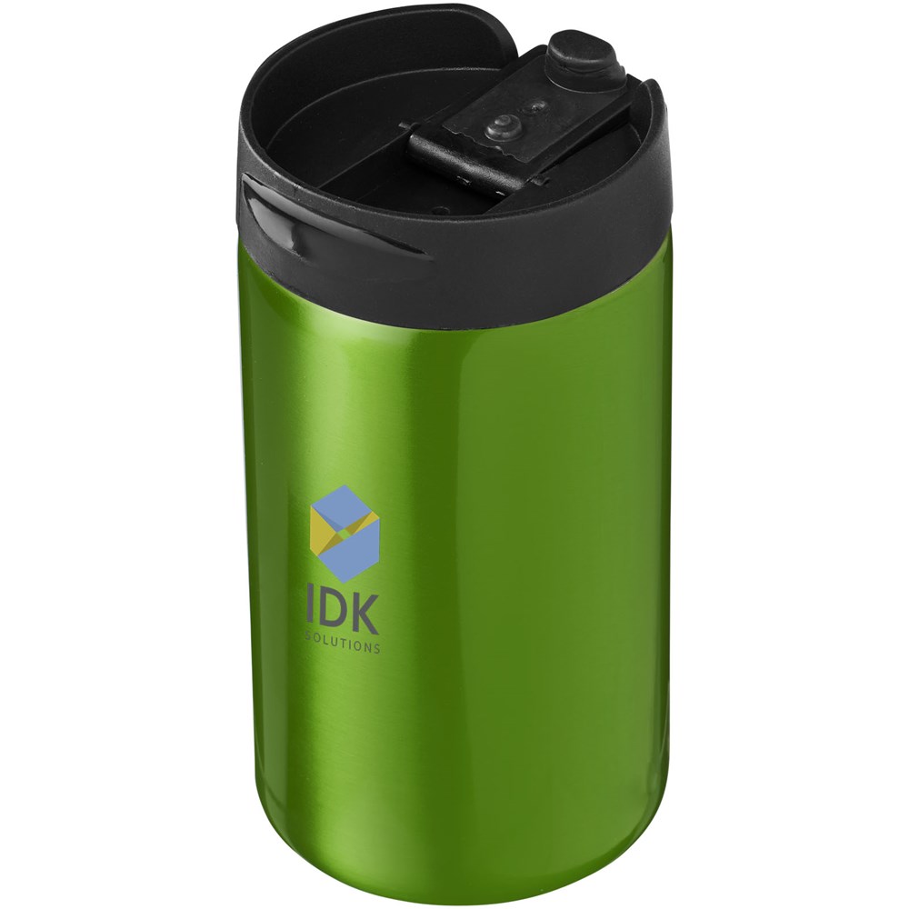 Doppelwandiger Becher mit Schraubdeckel und verriegelbarer Trinköffnung zum Aufklappen. Volumen 300 ml.