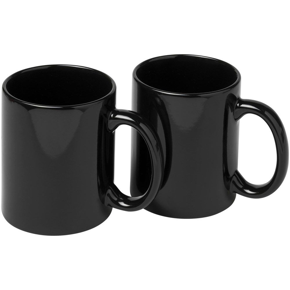 Geschenkset mit zwei keramischen 330-ml-Bechern. Präsentiert in einer weißen Geschenkbox mit durchsichtigem Fenster.