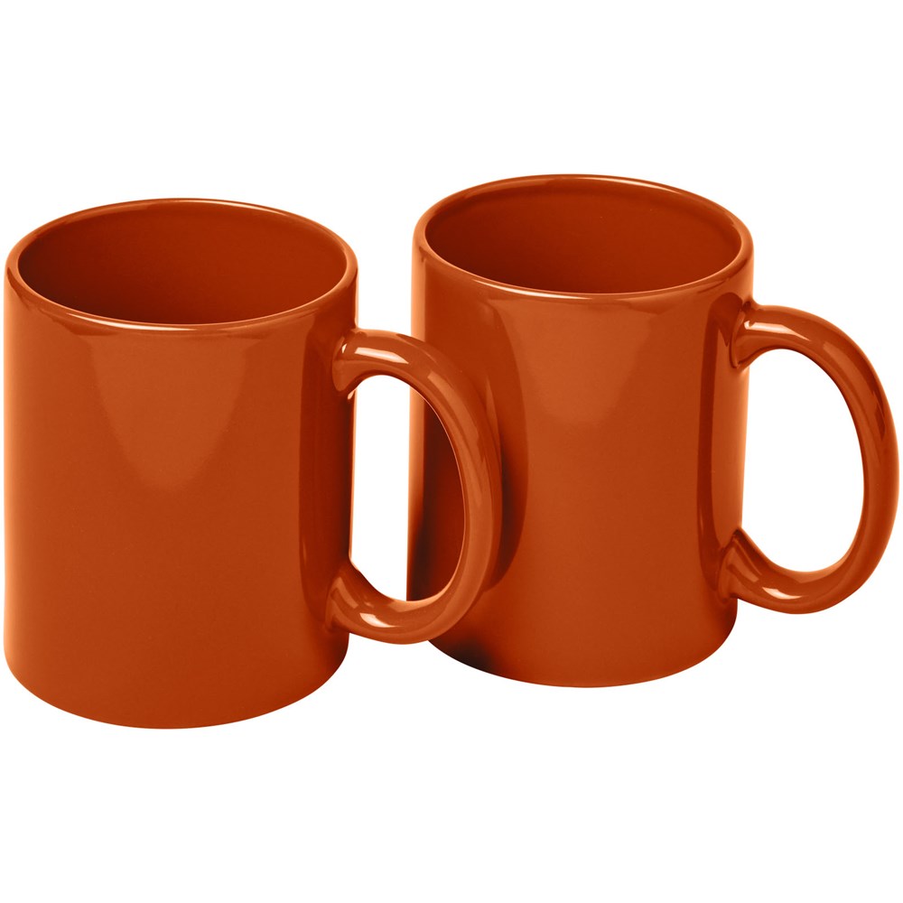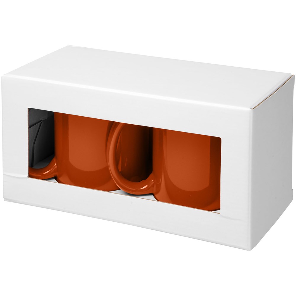 Geschenkset mit zwei keramischen 330-ml-Bechern. Präsentiert in einer weißen Geschenkbox mit durchsichtigem Fenster.