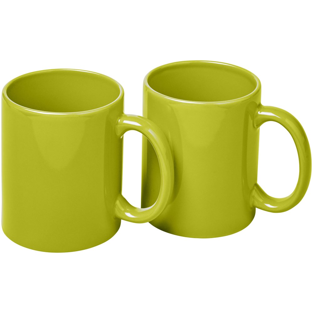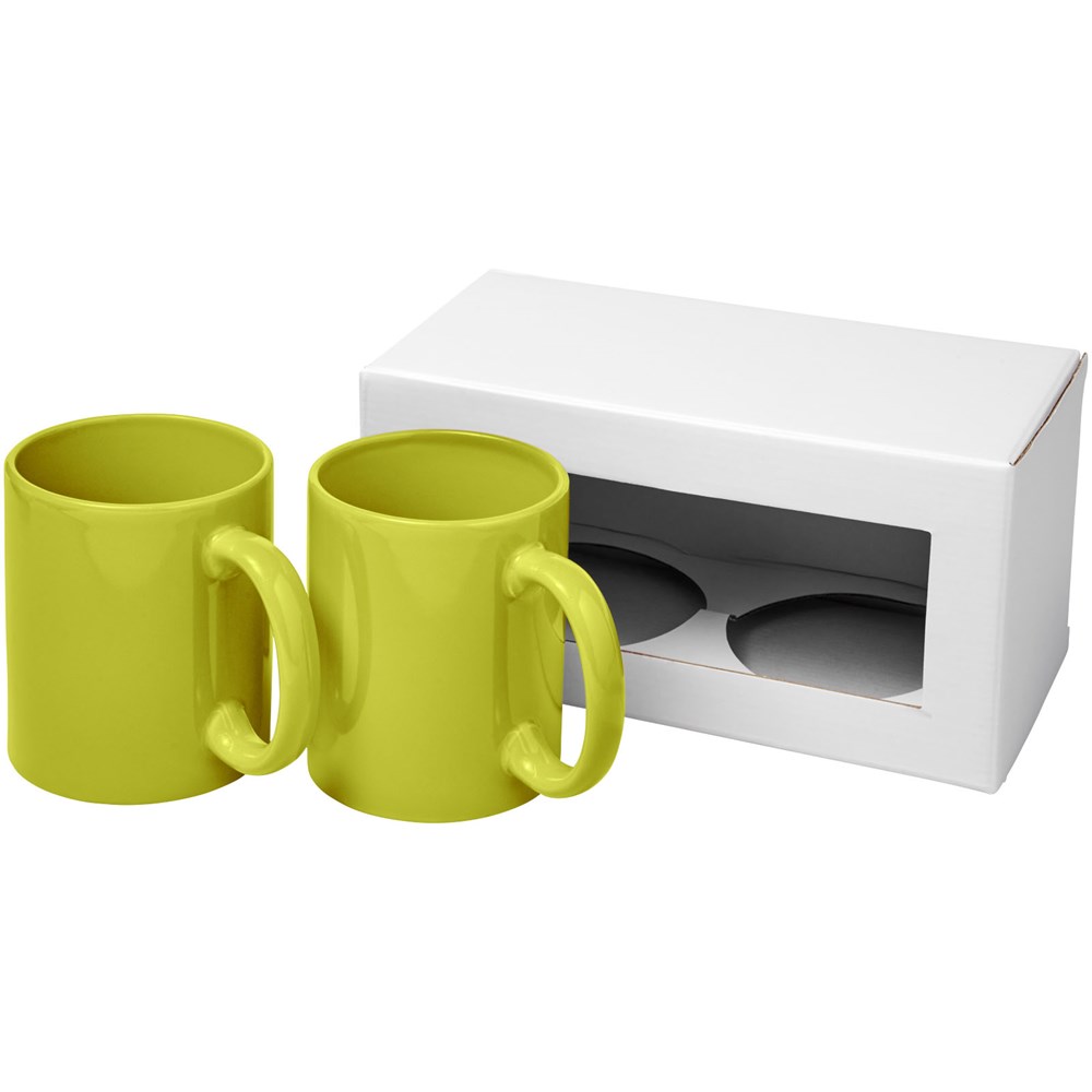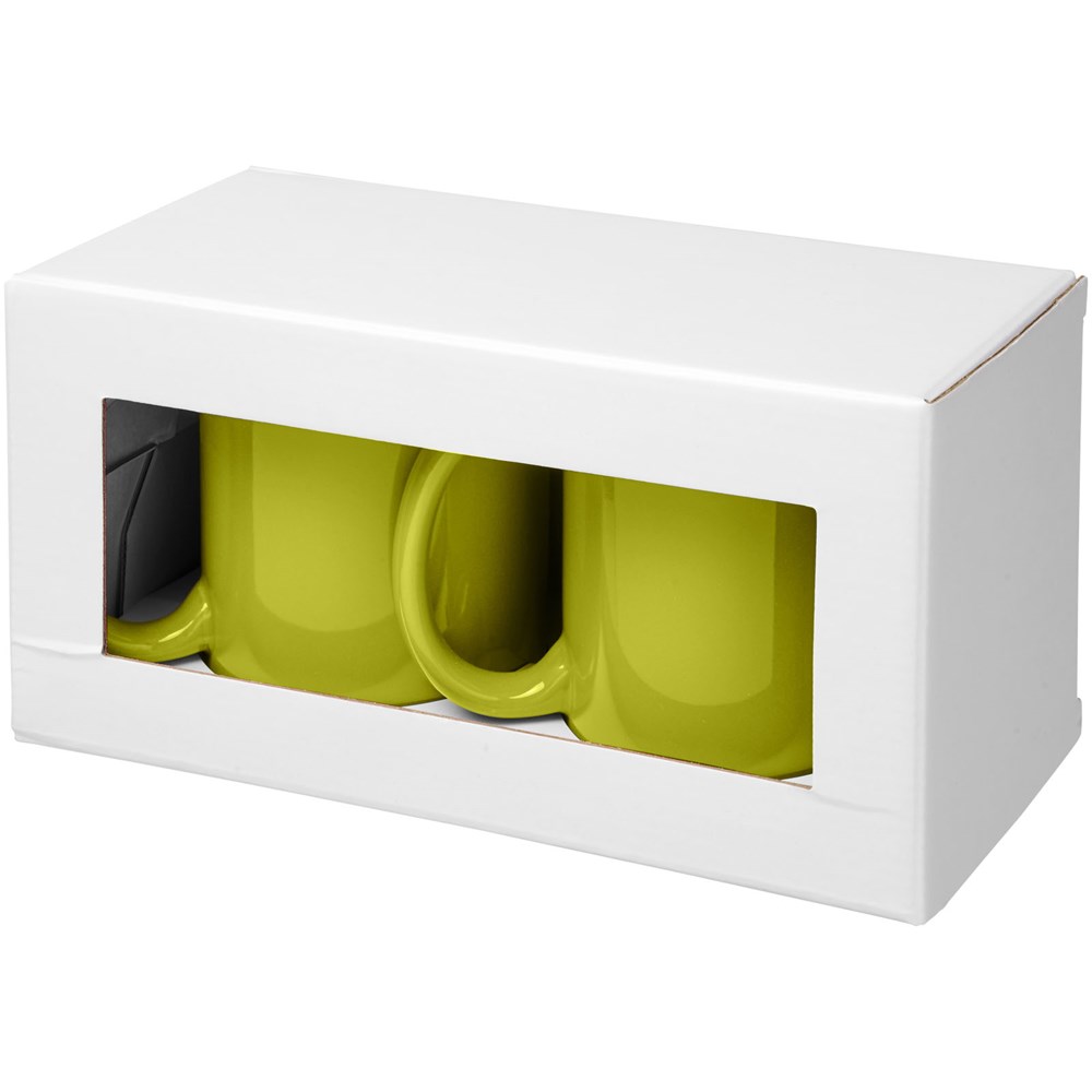 Geschenkset mit zwei keramischen 330-ml-Bechern. Präsentiert in einer weißen Geschenkbox mit durchsichtigem Fenster.