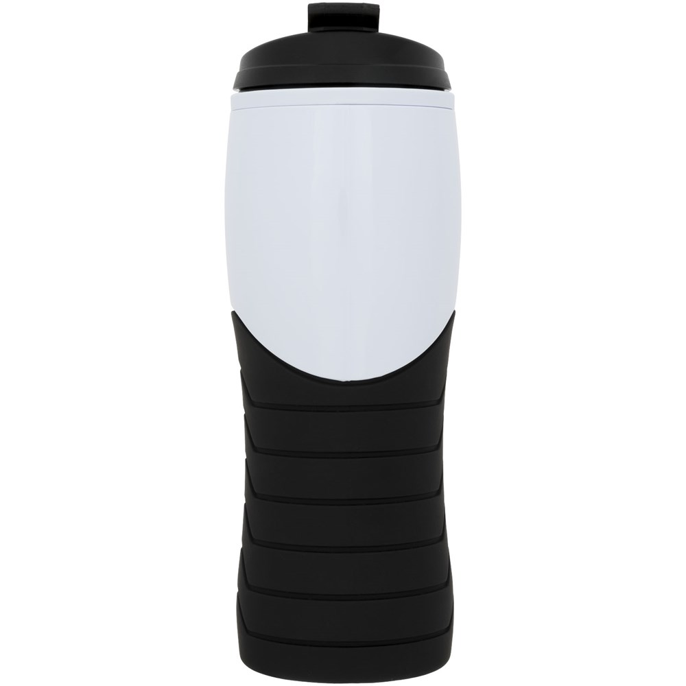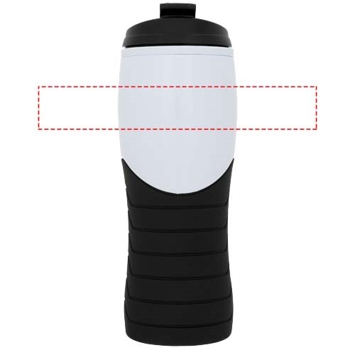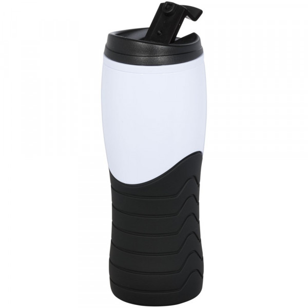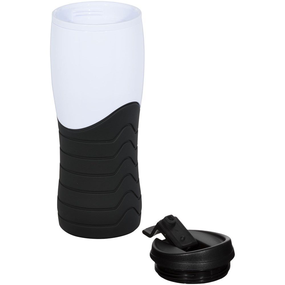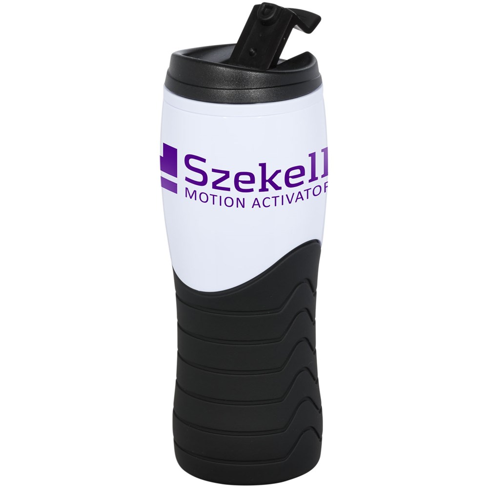 Doppelwandiger Becher mit auslaufsicherem Schraubdeckel. Verfügt über eine texturierte gummierte Basis mit glänzendem Oberteil. Fassungsvermögen 400 ml.