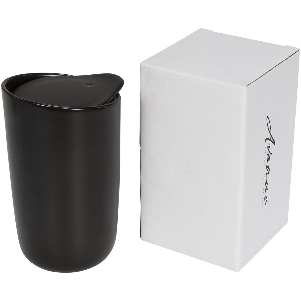 Schnuckeliger doppelwandiger Keramikbecher mit Keramikdeckel. Passt unter die meisten Kaffeemaschinen und ist mikrowellengeeignet. Entfernen Sie vor dem Stellen in die Mikrowelle die Silikondichtung am Keramikdeckel. Spülmaschinenfest EN12875-1 konform (bei bis zu 125 Waschvorgängen) für alle Werbeanbringungsmethoden. Fassungsvermögen 400ml. In einem Avenue-Geschenkkarton präsentiert.