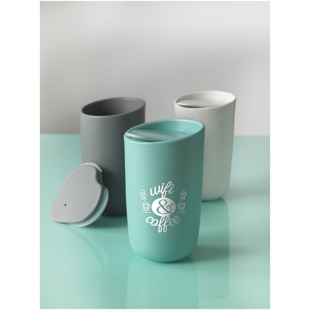 Schnuckeliger doppelwandiger Keramikbecher mit Keramikdeckel. Passt unter die meisten Kaffeemaschinen und ist mikrowellengeeignet. Entfernen Sie vor dem Stellen in die Mikrowelle die Silikondichtung am Keramikdeckel. Spülmaschinenfest EN12875-1 konform (bei bis zu 125 Waschvorgängen) für alle Werbeanbringungsmethoden. Fassungsvermögen 400ml. In einem Avenue-Geschenkkarton präsentiert.