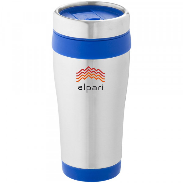 Doppelwandiger Becher mit Schraubverschluss, der mit dem Daumen geöffnet werden kann. Volumen 410 ml.