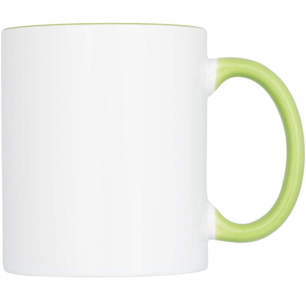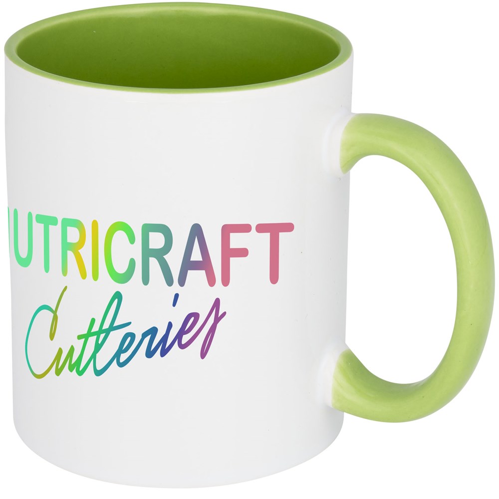 Dieser Keramikbecher in klassischem Design verfügt über eine spezielle Beschichtung für Sublimation. Der Becher hat eine farbige Innenseite mit Griff in passender Farbe. Spülmaschinenfest EN12875-1 konform (bei bis zu 125 Waschvorgängen) für alle Werbeanbringungsmethoden. Das Fassungsvermögen beträgt 330 ml. Präsentiert in einer weißen Pappschachtel.