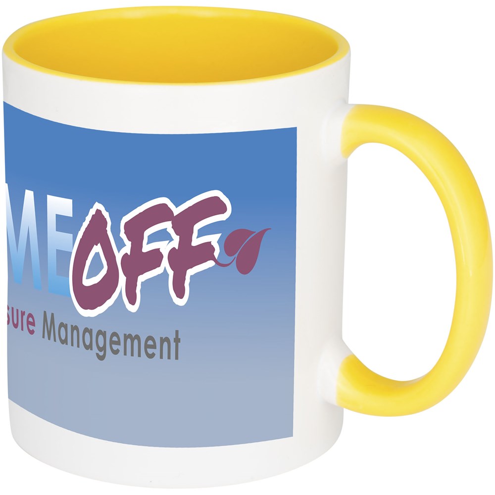 Dieser Keramikbecher in klassischem Design verfügt über eine spezielle Beschichtung für Sublimation. Der Becher hat eine farbige Innenseite mit Griff in passender Farbe. Spülmaschinenfest EN12875-1 konform (bei bis zu 125 Waschvorgängen) für alle Werbeanbringungsmethoden. Das Fassungsvermögen beträgt 330 ml. Präsentiert in einer weißen Pappschachtel.