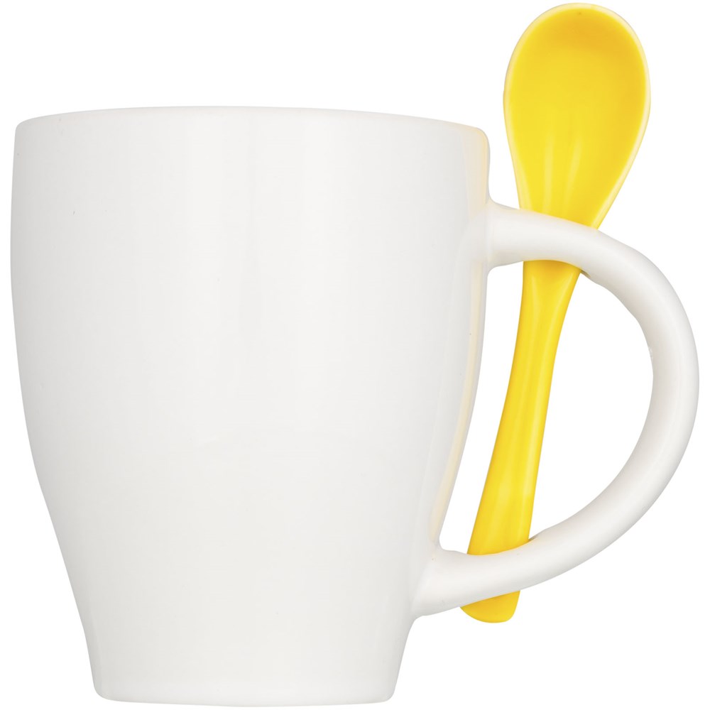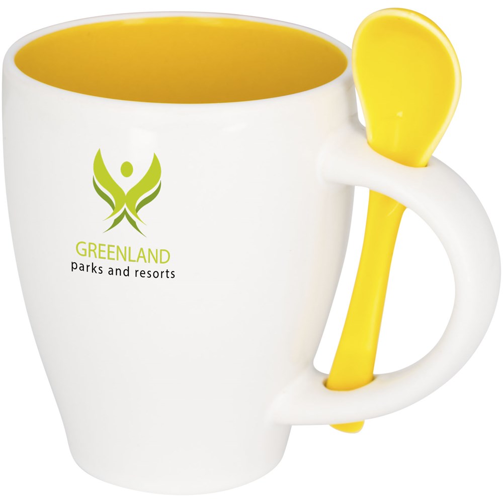 Keramiktasse mit einem modischen Design und integriertem Löffelhalter im Griff. Die Innenseite der Tasse ist gefärbt und kommt mit einem farblich passenden Löffel. Spülmaschinenfest EN12875-1 konform (bei bis zu 125 Waschvorgängen) für alle Werbeanbringungsmethoden. Fassungsvermögen beträgt 250ml. Präsentiert in einer weißen Kartonschachtel.