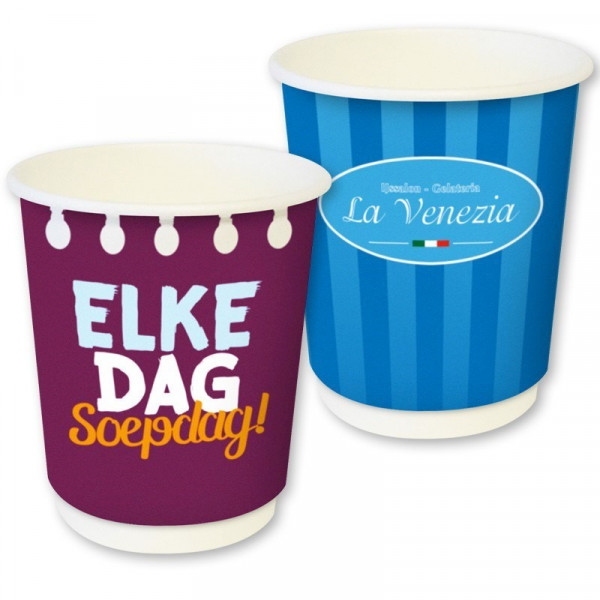 Kartonbecher 8 Oz. Doppelwandig im offsetdruck oder Digitaldruck, Euroskala. mehr