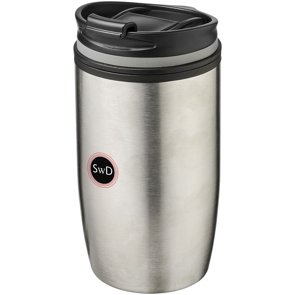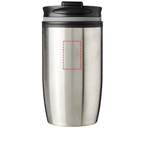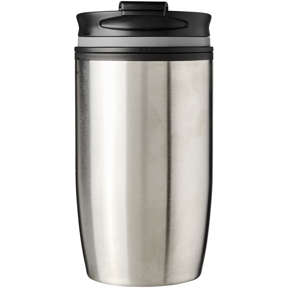 Doppelwandiger, isolierter Becher mit Schraubdeckel und verriegelnder Klappdeckelöffnung. Das Deckel-Design ermöglicht die Verriegelung des Klappdeckels sowohl im geschlossenen als auch im geöffneten Zustand. Das Fassungsvermögen beträgt 330 ml.