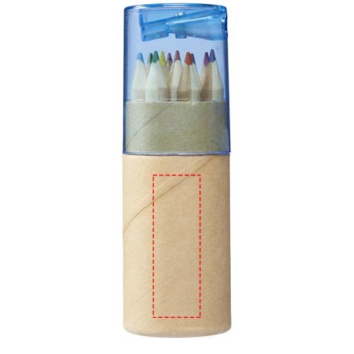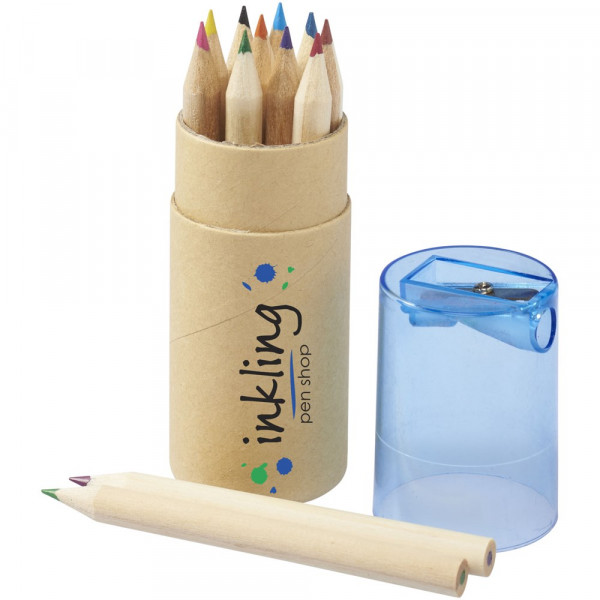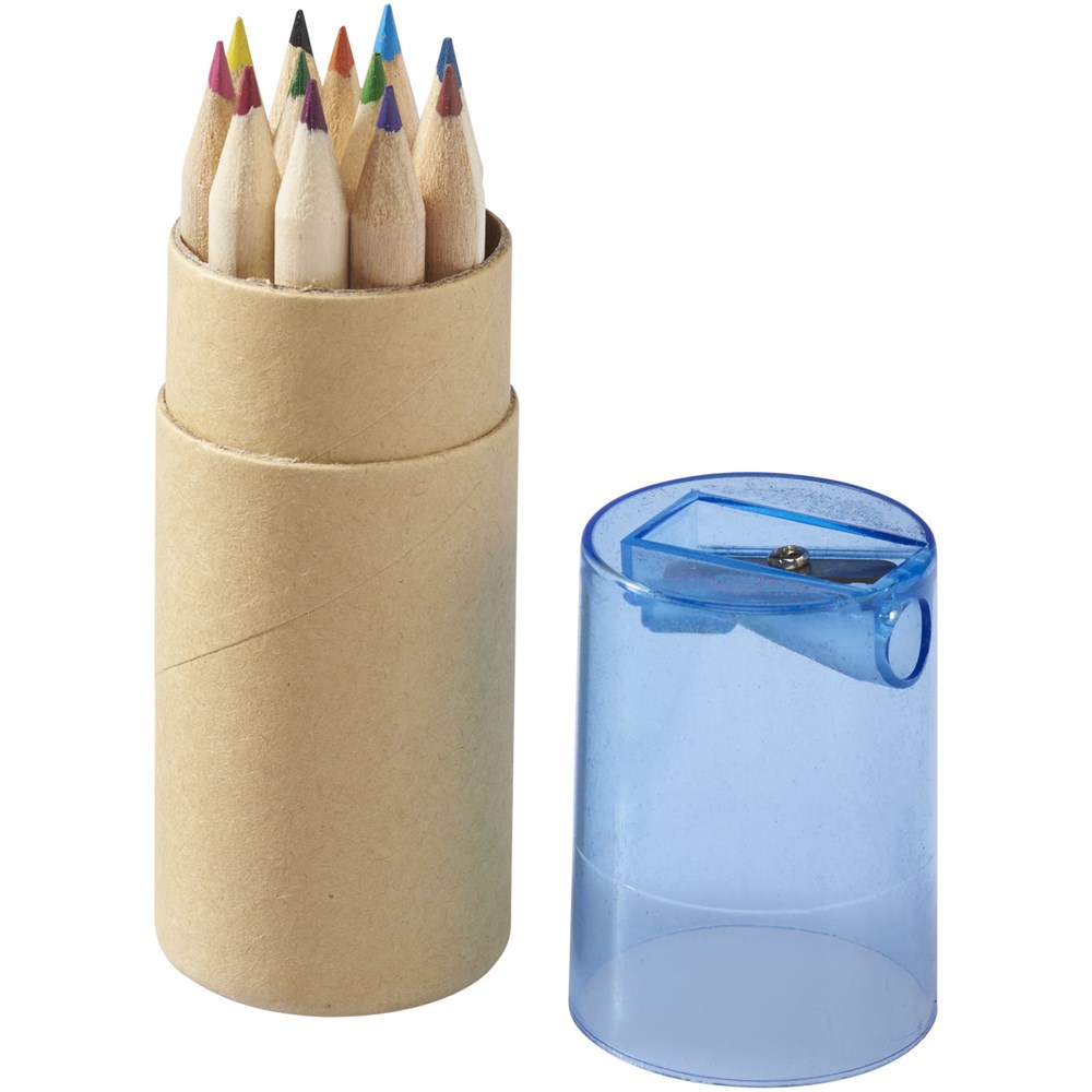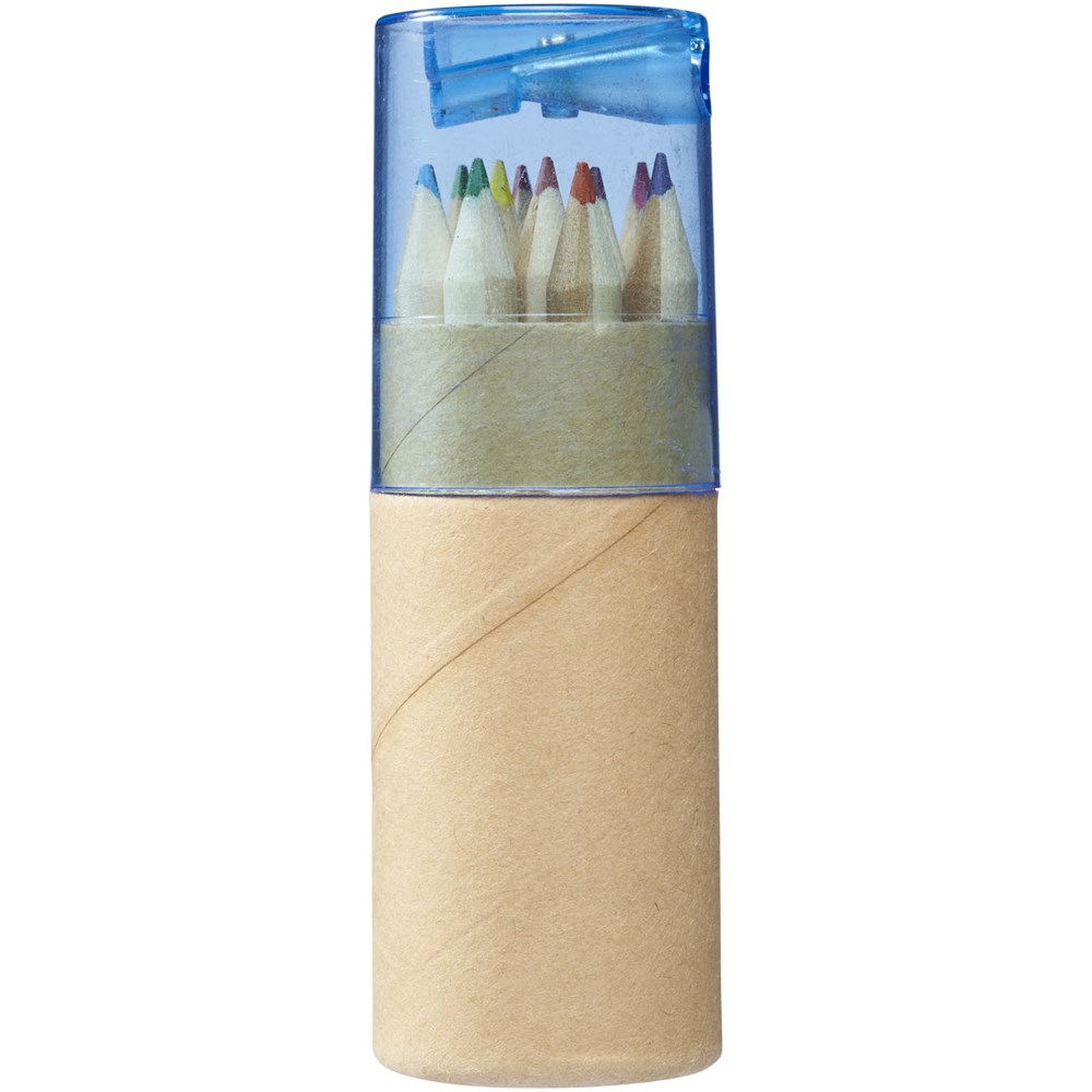 12 Buntstifte in zylinderförmigem Karton mit Spitzer im Kunststoffdeckel.