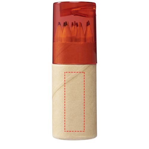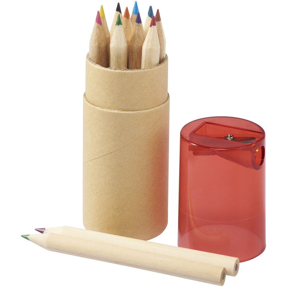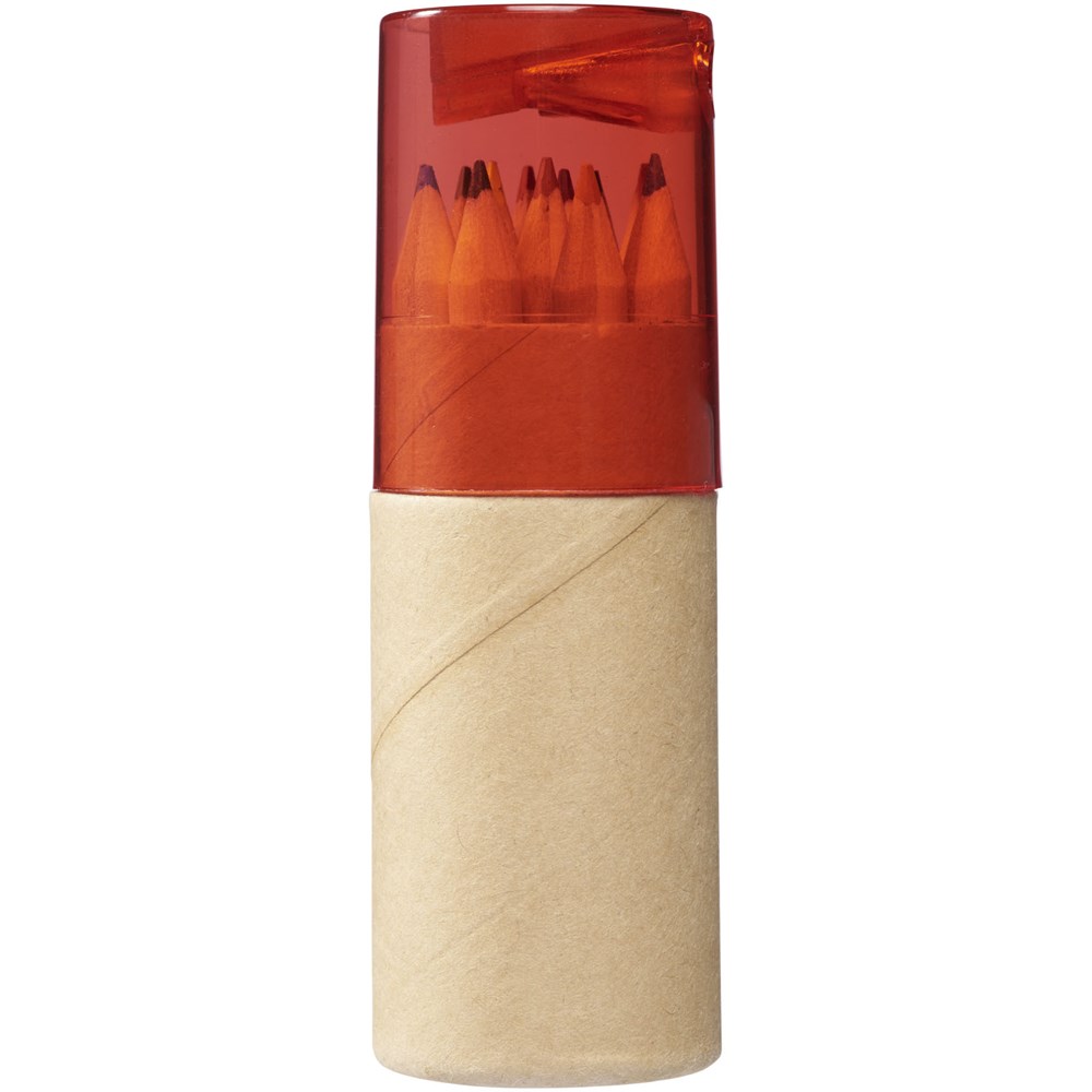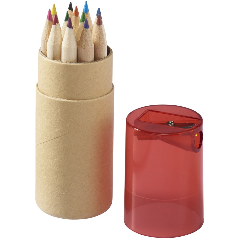 12 Buntstifte in zylinderförmigem Karton mit Spitzer im Kunststoffdeckel.