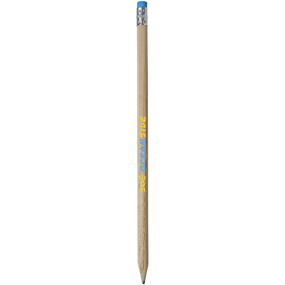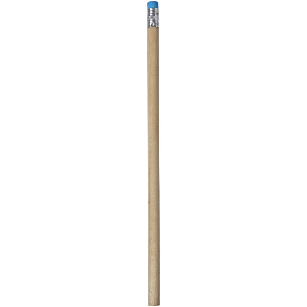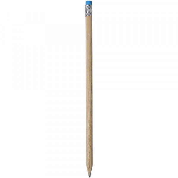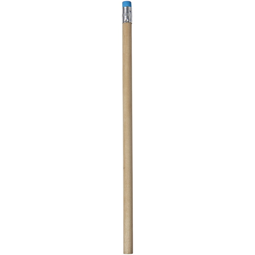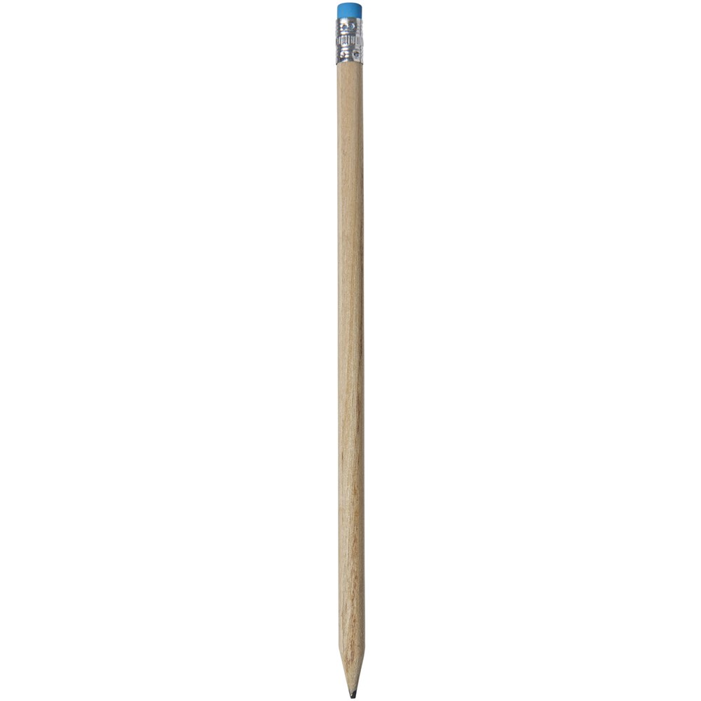 Hölzerner Bleistift mit natürlichem Schaft und farbigem Radiergummi. Nicht angespitzt.