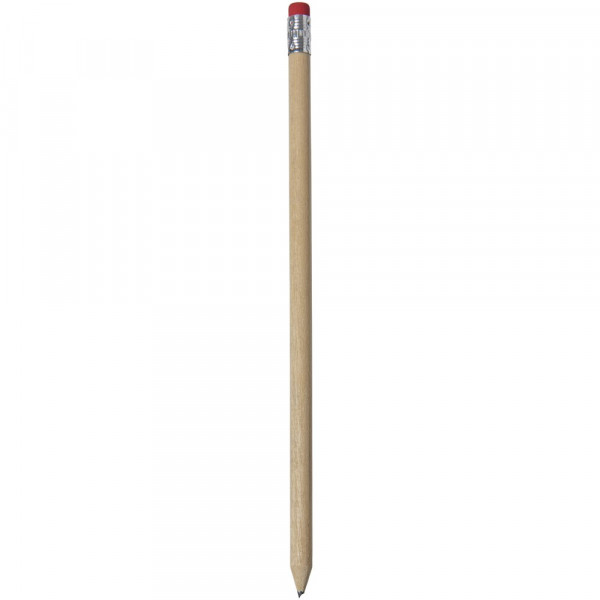 Hölzerner Bleistift mit natürlichem Schaft und farbigem Radiergummi. Nicht angespitzt.