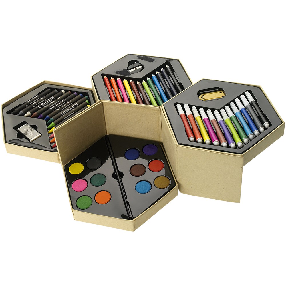 12 Marker, 12 Buntstifte, 12 Wachsmalstifte, 12 Wasserfarben, Pinsel, Spitzer, Radiergummi und große Büroklammer.