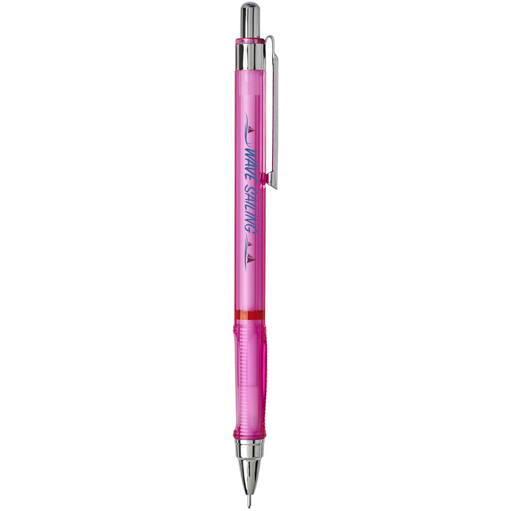 Druckbleistift zum dynamischen Schreiben und Skizzieren. Ausgestattet mit einem Metallmechanismus mit einziehbarer Mine. Dreieckiger Griff für bequemes Gefühl. Einziehbare Spitze und verfügt über hochpolymere 2B-Minen. Spitzengröße: 0,7mm.