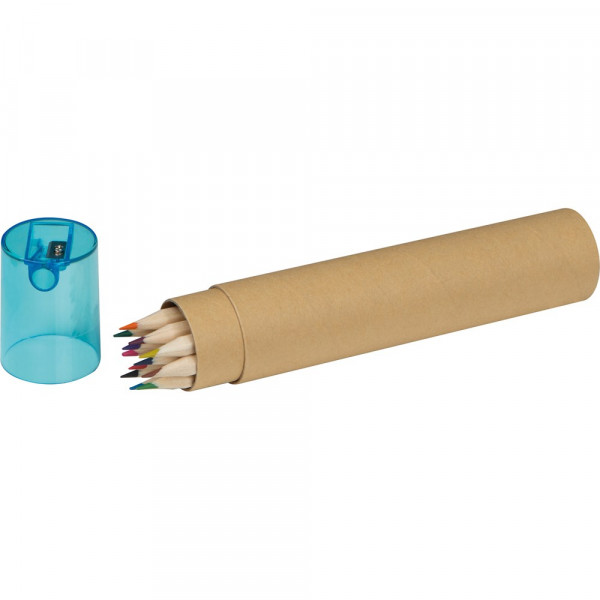12 lange Holz-Buntstifte in einem runden Pappköcher mit Anspitzer. Ihre Werbung drucken wir auf den Köcher.