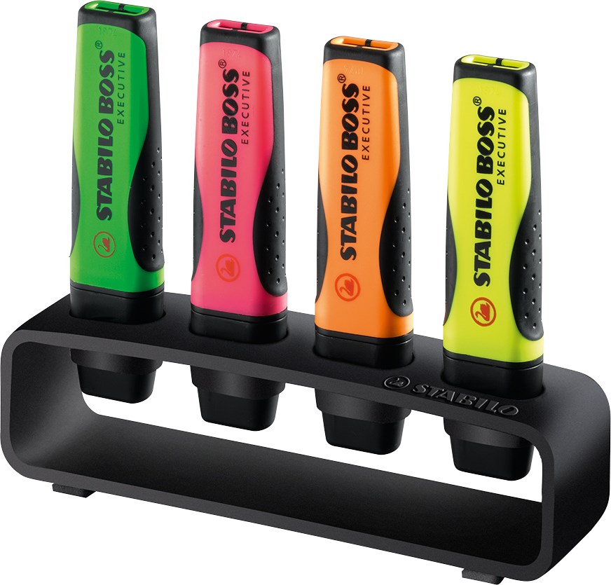 STANDFESTE WERBEBOTSCHAFT. Stylisches Tisch-Set mit 4 Textmarkern STABILO BOSS EXECUTIVE mit weicher, ergonomischer Griffzone und einzigartiger patentierter Anti-Schmier-Tinte. Setzt Werbebotschaften auf dem Schreibtisch standfest in Szene: Platz für Werbung auf allen 4 Textmarkern und dem Tisch-Set.
