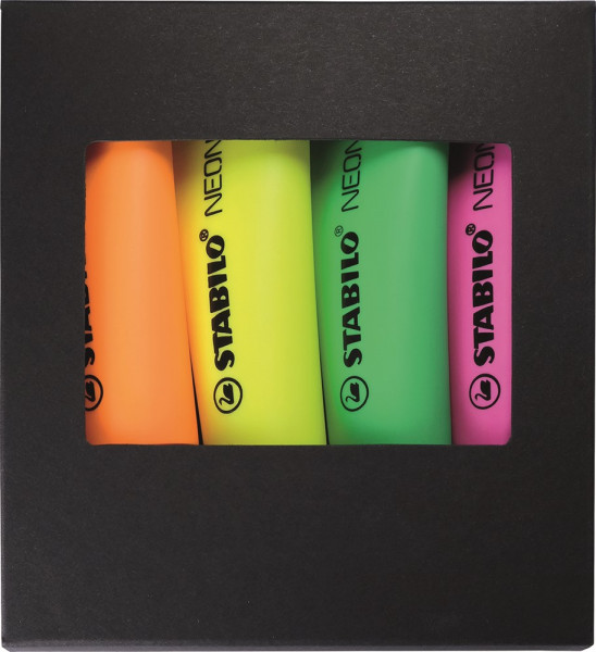 MIT LEUCHTENDEN BOTSCHAFTEN TUBENWEISE AUFFALLEN. Set bestehend aus 4 Highlightern STABILO NEON im schwarzen Karton-Etui. Moderne Textmarker im stylisch minimalistischen Tubendesign mit sanfter Oberfläche für komfortable, angenehme Haltung. Tinte auf Wasserbasis mit Anti-Dry-Out Technology: 4 Stunden Austrockenschutz für konzentriertes Arbeiten.