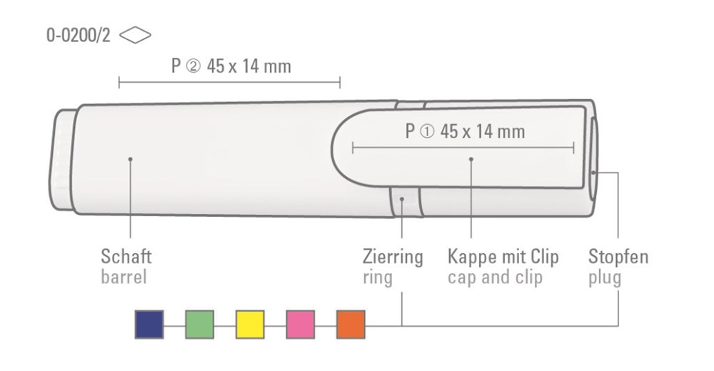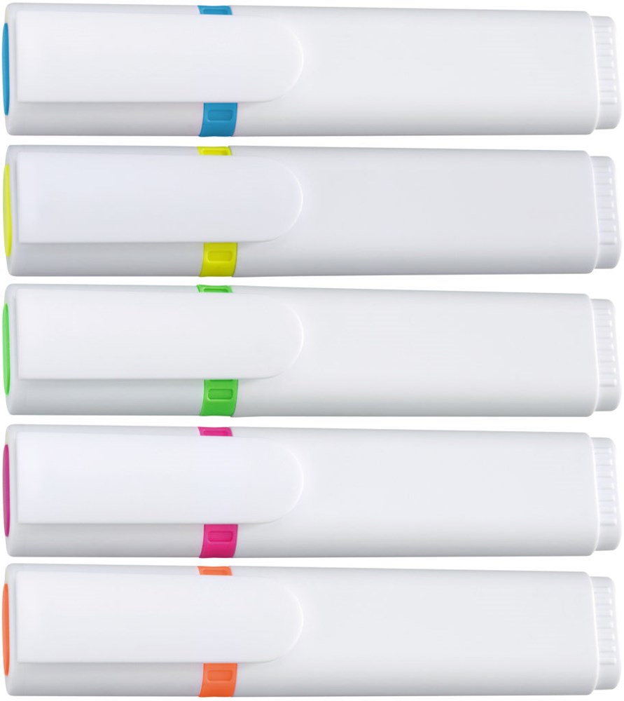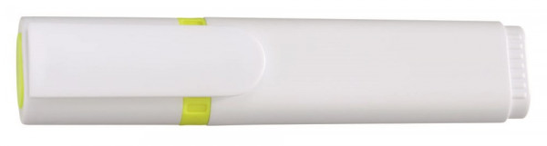 Textmarker mit Kunststoffgehäuse und Kappe mit Clip in weiß. Mundstück mit Zierring und Stopfen in der Schreibfarbe. Standardfarben gelb, grün, magenta. Weitere Farben auf Anfrage.