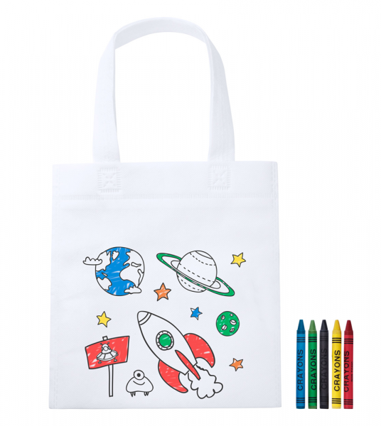 Non-Woven Einkaufstasche für Kinder zum Ausmalen, mit 5 Wachsmalstiften.