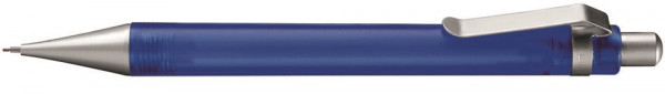 Druckbleistift (0,7mm) mit transparent gefrostetem oder gedecktem Schaft. Metalldrücker, -clip und -spitze verchromt.