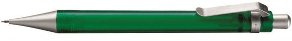 Druckbleistift (0,7mm) mit transparent gefrostetem oder gedecktem Schaft. Metalldrücker, -clip und -spitze verchromt.