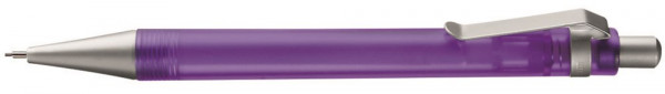Druckbleistift (0,7mm) mit transparent gefrostetem oder gedecktem Schaft. Metalldrücker, -clip und -spitze verchromt.
