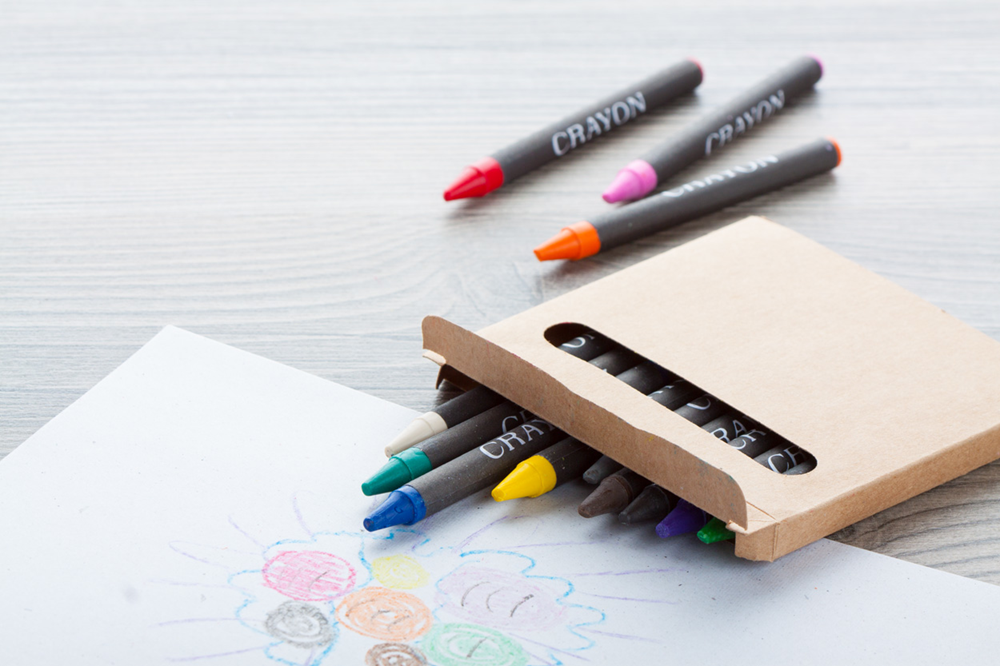 12 Wachsmalstifte in Pappschactel.