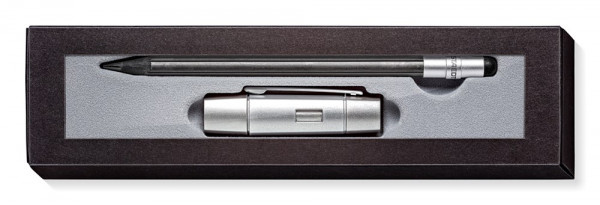 Bleistift hergestellt aus dem innovativen WOPEX Material, Holzanteil aus PEFC-zertifizierten deutschen Wäldern, mit Stylus Pen-Spitze aus neuem, leitfähigem Material, geeignet für alle Geräte mit kapazitivem Gewebe (z. B. Apple iPad, iPhone, Samsung Galaxy, HTC, usw.), Kappe als Bleistiftverlängerer mit eingebautem Spitzer und Radiertip unter dem abziehbaren Kappendeckel und hochwertigem Clip aus Metall, 1 Bleistift und 1 Verlängerer in attraktiver Kartonverpackung, Made in Germany