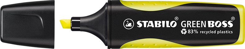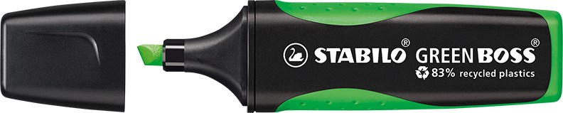 GRÜNES GEWISSEN BEI VOLLER LEUCHTKRAFT. Textmarker aus 83% recyceltem Kunststoff in klassischer STABILO BOSS Form mit weicher, ergonomischer Griffzone. 2 Strichstärken, nachfüllbare Tinte. Hohe Offenlagerfähigkeit – bis zu 4 Stunden.