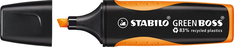 GRÜNES GEWISSEN BEI VOLLER LEUCHTKRAFT. Textmarker aus 83% recyceltem Kunststoff in klassischer STABILO BOSS Form mit weicher, ergonomischer Griffzone. 2 Strichstärken, nachfüllbare Tinte. Hohe Offenlagerfähigkeit – bis zu 4 Stunden.