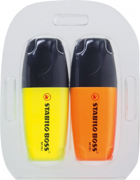 KLEINE GRÖSSE – GROSSE LEUCHTKRAFT! Etui mit 2 STABILO BOSS Leuchtmarkierern im Mini-Format. STABILO-Qualität in Verarbeitung, Tinte und Schreibkomfort. Hohe Offenlagerfähigkeit.