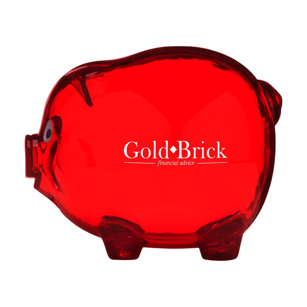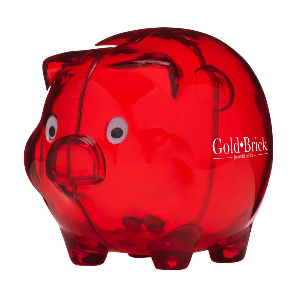 Sparschwein aus transparentfarbigem Kunststoff. Keine abschließbare Öffnung. Pro Stück in einer Verpackung.