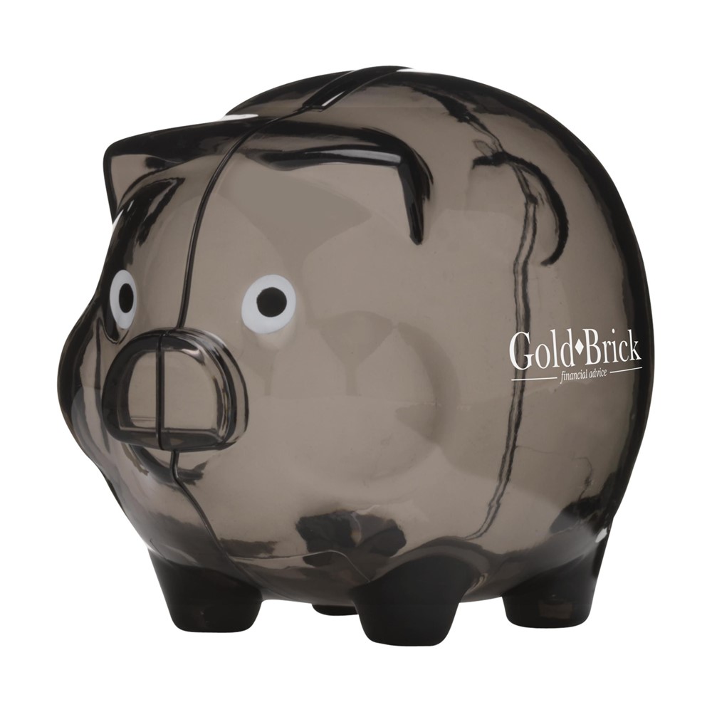 Sparschwein aus transparentfarbigem Kunststoff. Keine abschließbare Öffnung. Pro Stück in einer Verpackung.