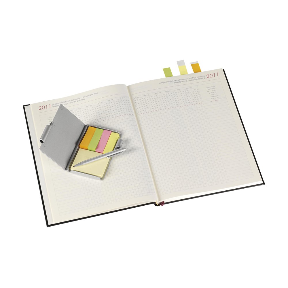 Kunststoffkassette mit ca. 75 selbstklebenden Notizblättern und ca. 280 fluoreszierenden Blattmerkern in 4 verschiedenen Farben, mit blauschreibendem Kugelschreiber.