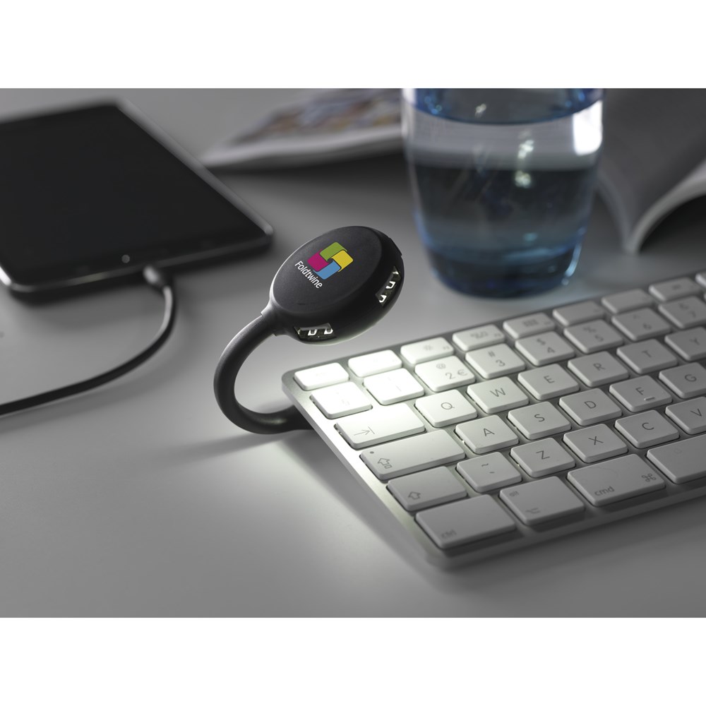 Multifunktionaler 2.0 USB HUB mit biegbarer Lampe, versehen mit 5 energieeffizienten LED-Lampen und 4 USB-Ports. Geeignet für Laptops mit USB-Anschluss. Diese Lampe sorgt für wohltuendes Licht beim Lesen.