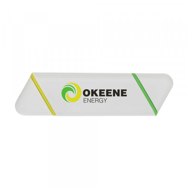 Textmarker mit 2 verschiedenen Neonfarben und Spitze in Spachtelform und damit in zwei verschiedenen Schreibbreiten.