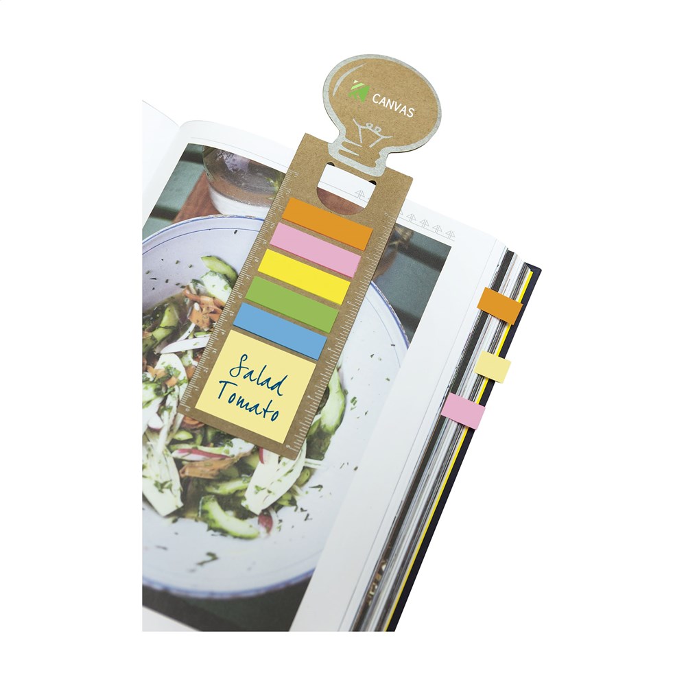 Lesezeichen aus stabilem Karton mit 15 selbstklebenden Memoblättchen, 75 beschreibbaren Markierstickern und Lineal (Länge 13 cm/5 inches).