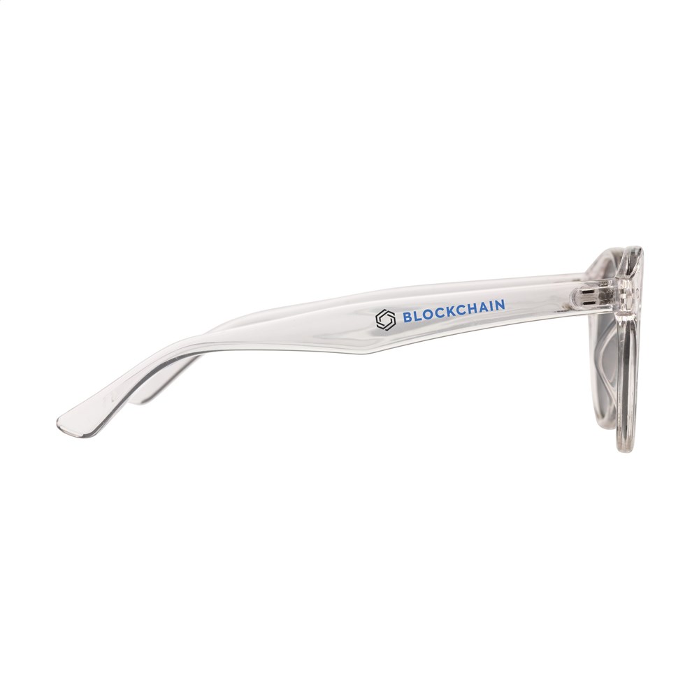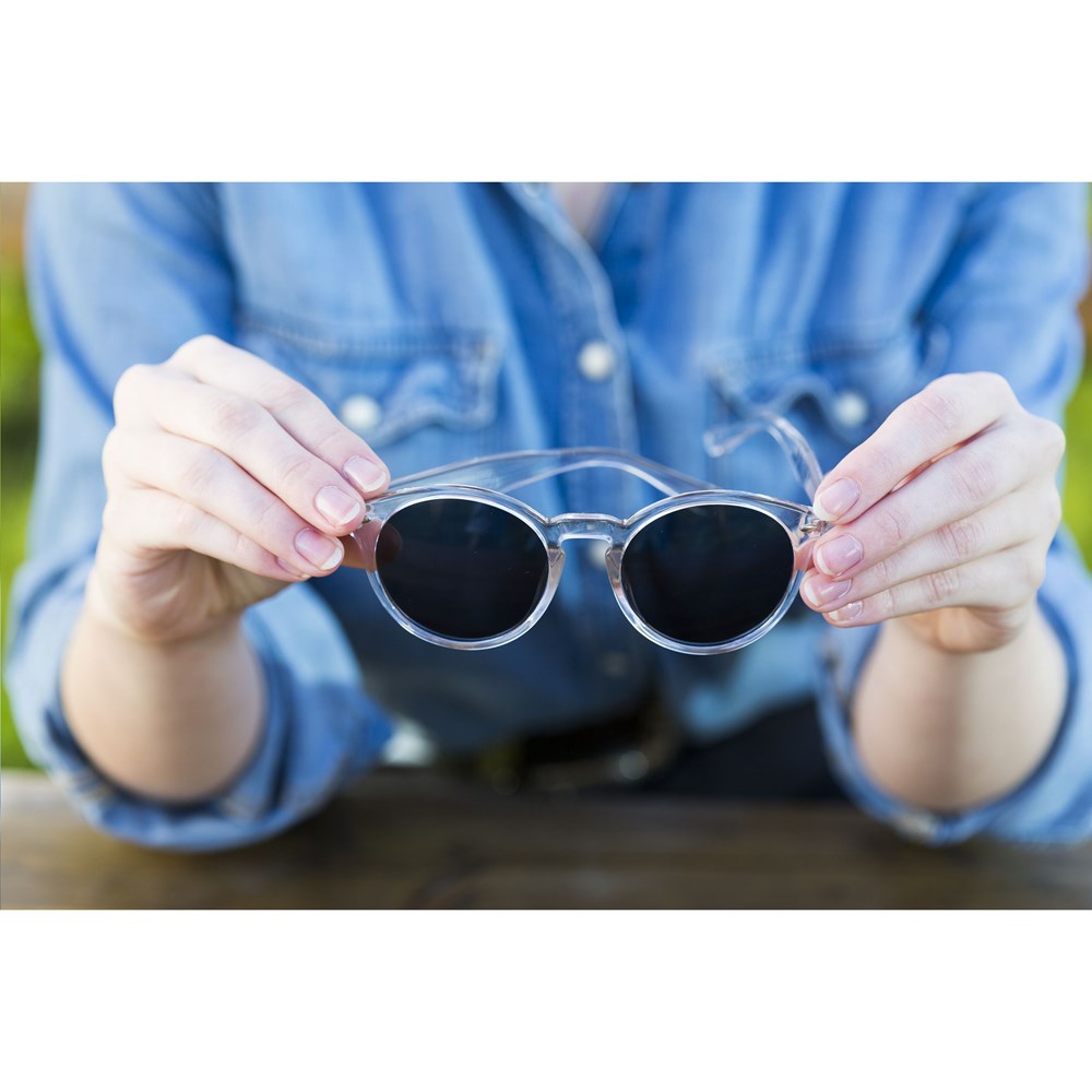 Sonnenbrille mit modischer runder Fassung und schwarzen Gläsern. Bietet UV 400-Schutz (gemäß europäischen Normen).