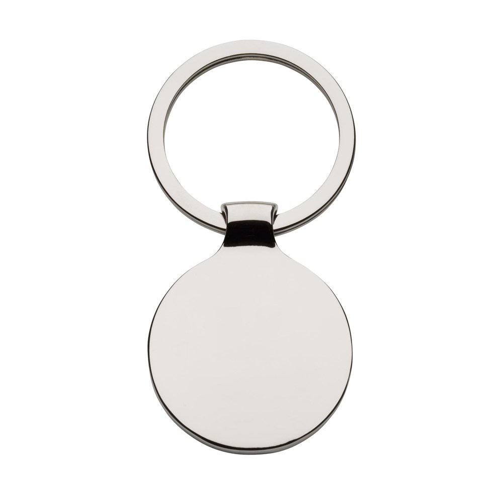 Runder, hochglänzender Schlüsselanhänger aus Nickel mit schwarzem Metall-Inlay und festem Schlüsselring. Schick und exklusiv. Pro Stück in einer Verpackung.