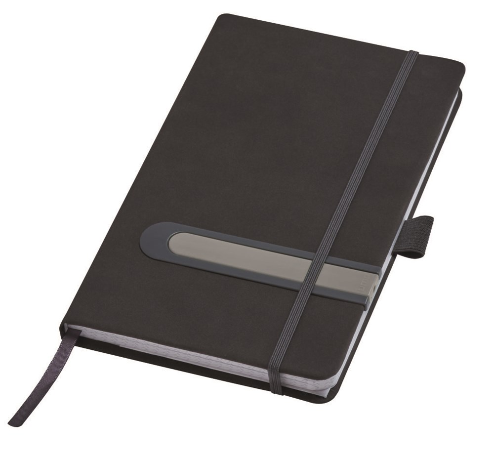 Notizbuch mit Hardcover aus PU-Material A5 210 x 130 mm in schwarz oder weiß mit integriertem farbigem Notizschreiber (1.000m). Runde Ecken, 6 mm Elastikverschlussband, Satin-Lesezeichen, Stifteschlaufe. Visitenkartenfach und Einstecktasche. 190 Notizseiten aus 80gr/m² weißem Papier 1/0 farbig bedruckt, alle Seiten druckgleich kariert.