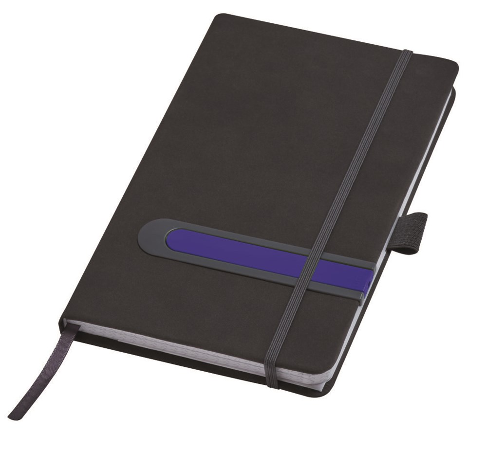 Notizbuch mit Hardcover aus PU-Material A5 210 x 130 mm in schwarz oder weiß mit integriertem farbigem Notizschreiber (1.000m). Runde Ecken, 6 mm Elastikverschlussband, Satin-Lesezeichen, Stifteschlaufe. Visitenkartenfach und Einstecktasche. 190 Notizseiten aus 80gr/m² weißem Papier 1/0 farbig bedruckt, alle Seiten druckgleich kariert.