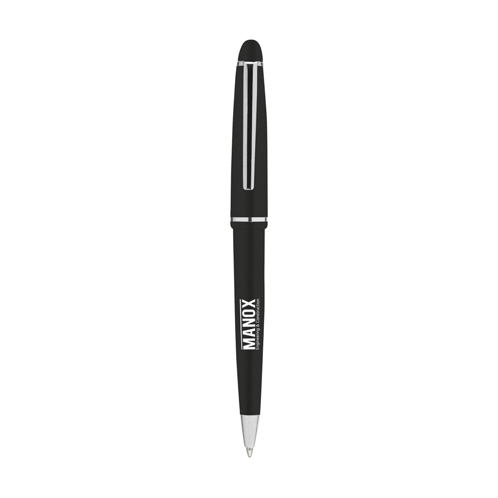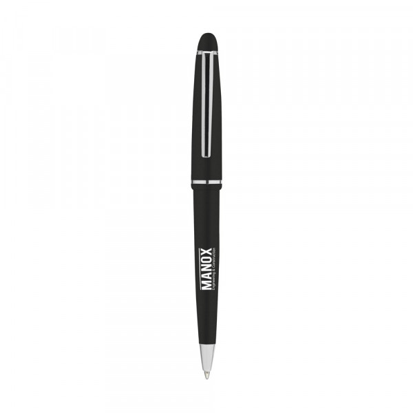 Blauschreibender Kugelschreiber mit poliertem Gehäuse, verchromtem, zierlichem Clip und Spitze und Druckkappensystem.