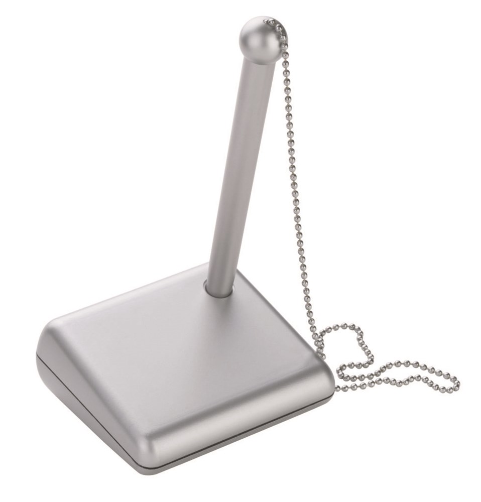 Kugelschreiberständer in silber mit passendem Kugelschreiber Modell TURBO an Metallkette (50 cm). Geliefert in praktischer Präsentverpackung. Minentype: uma Tech Refill 1.0, schwarzes Rohr Minenfarbe: blau