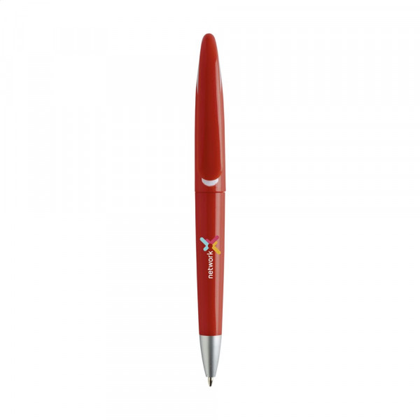 Blauschreibender Kugelschreiber mit fein geschwungenem Clip mit weißem Akzent und Drehklicksystem. mehr