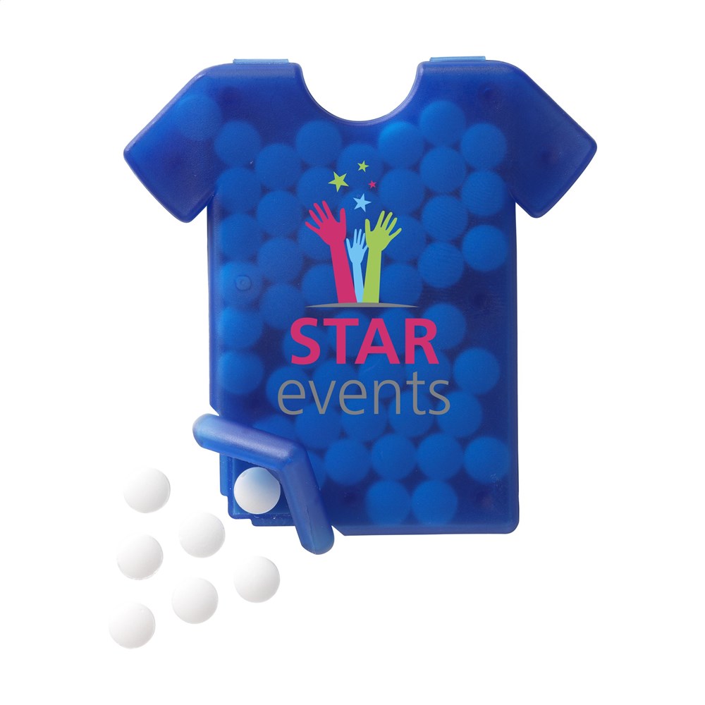 Spender in T-Shirt Form mit ca. 8 g (50 Stück) zuckerfreien Pfefferminz.