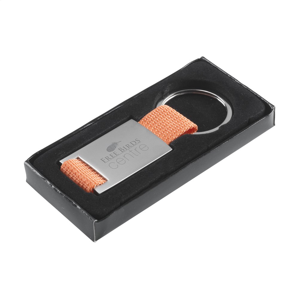 Schlüsselanhänger aus mattem Stahl mit einem stark gewebten Nylonriemen und Schlüsselring. Pro Stück in einer Verpackung.