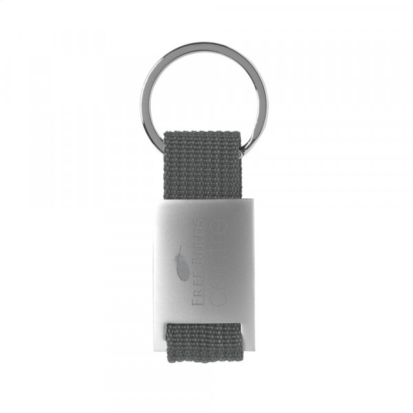Schlüsselanhänger aus mattem Stahl mit einem stark gewebten Nylonriemen und Schlüsselring. Pro Stück in einer Verpackung.