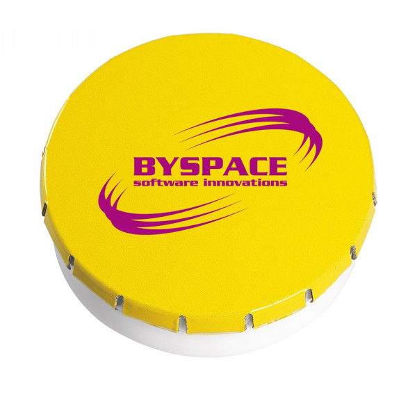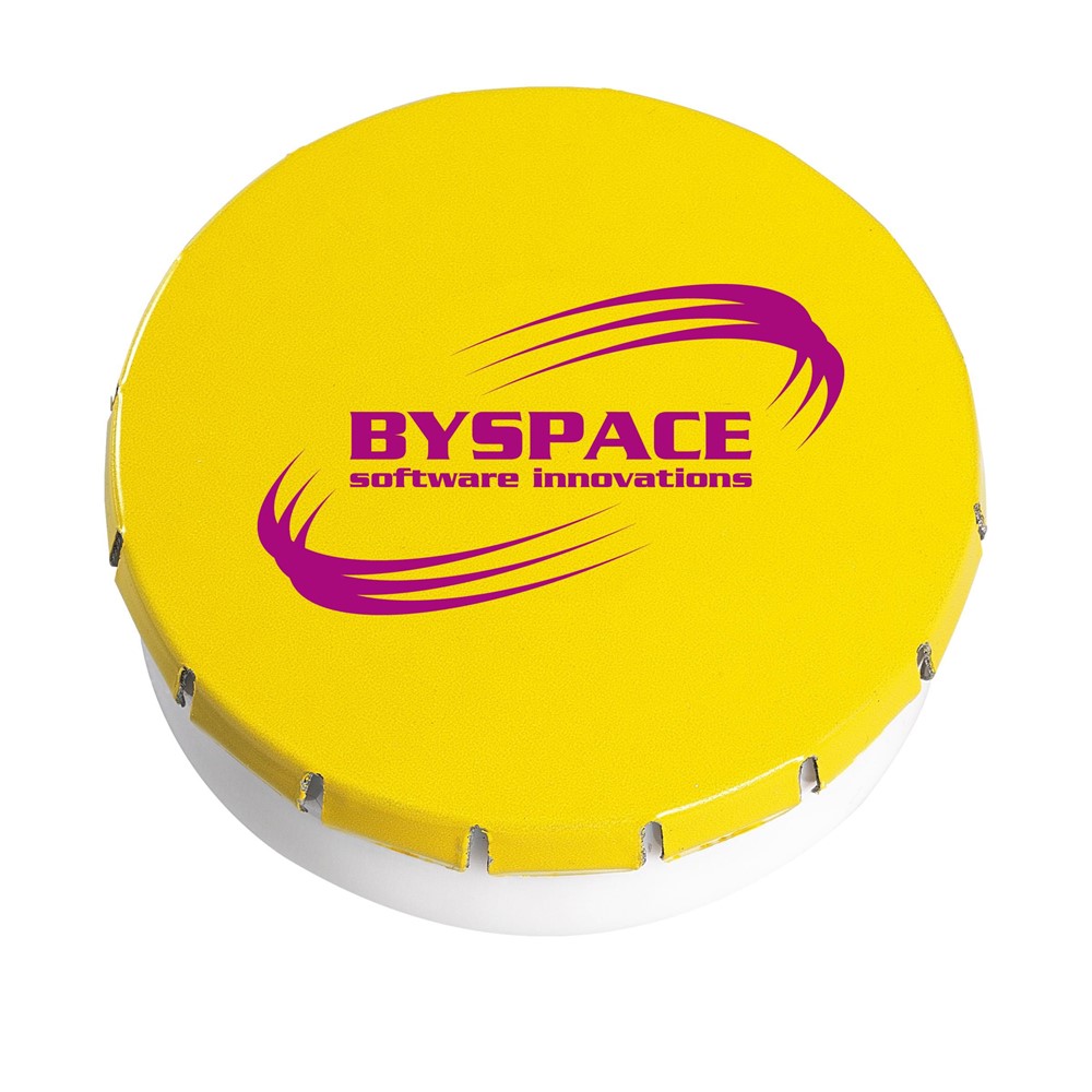 Promotionsdose aus Kunststoff mit Metalldeckel und handlichem Dreh-/Klicksystem. Gefüllt mit ca. 12 g (75 Stück) zuckerfreien Pfefferminz. Bitte beachten Sie: Auf der weißen und der silbernen Dose ist leider kein Full Colour Druck möglich.