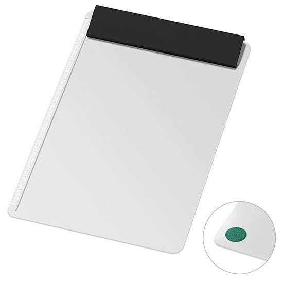 mit Klemmleiste, seitlichem Anschlag und 30 cm Skala. Ein beliebter Werbeträger, immer im Blickfeld bei Messen, Schulungen, im Büro oder Lager, mit 4 geräuschdämpfenden Filzpunkten auf der Plattenrückseite, ohne Papier.